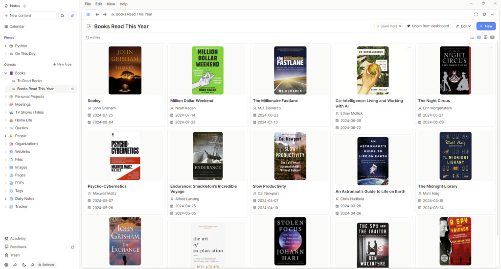 I have been testing out Capacities of late and thought I would do a walkthrough of creating a beautiful looking reading list / library that looks something like the below: