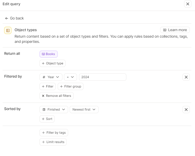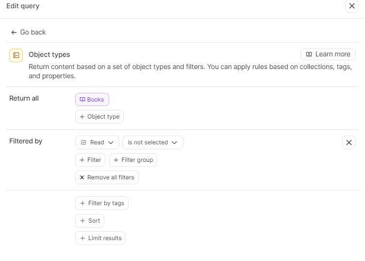 And there we have it, we worked through templates, properties, objects and queries to understand how Capacities works whilst at the same time creating a beautiful looking reading list / library.