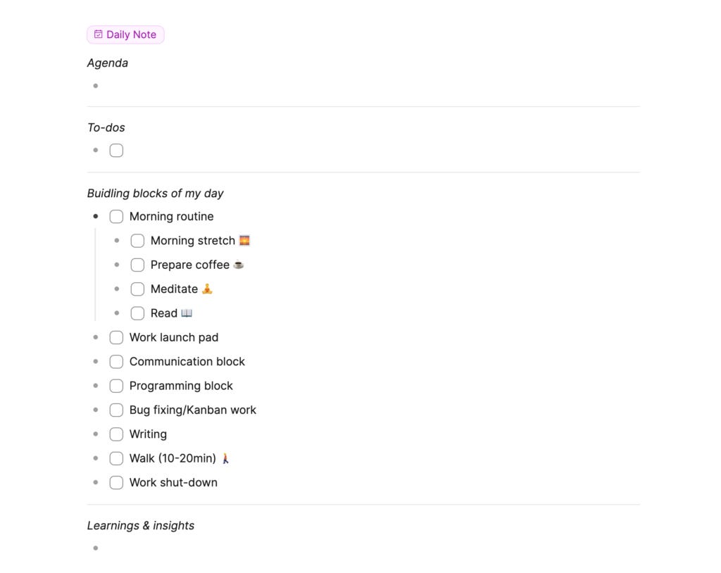 Interesting article from the Capacities team on “People ask us how we are using the daily notes in Capacities. Here’s my answer.”. Michael heavily relies on the daily note and uses it to structure his whole day and come back to it throughout the day. For this he uses the following template. To read through the full article, click here.