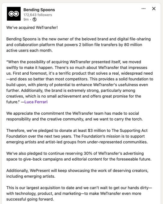 Here is something I am sure no-one expected. Bending Spoons (owners of Evernote), purchased WeTransfer (popular digital file-sharing and collaboration platform). Surprising stuff.