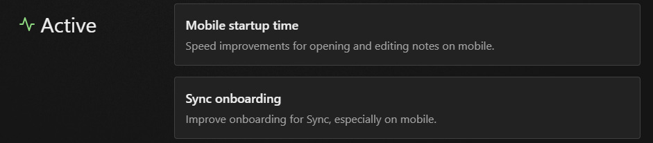 The Obsidian roadmap has been updated to include Mobile startup time – Speed improvements for opening and editing notes on mobile and Sync onboarding- Improve onboarding for Sync, especially on mobile.