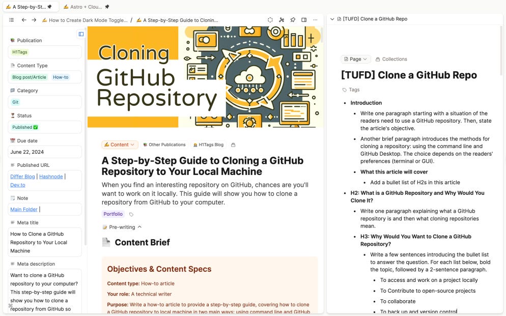 This includes content briefs (i.e., content type, objectives, target audience), outlines, and maybe research notes.