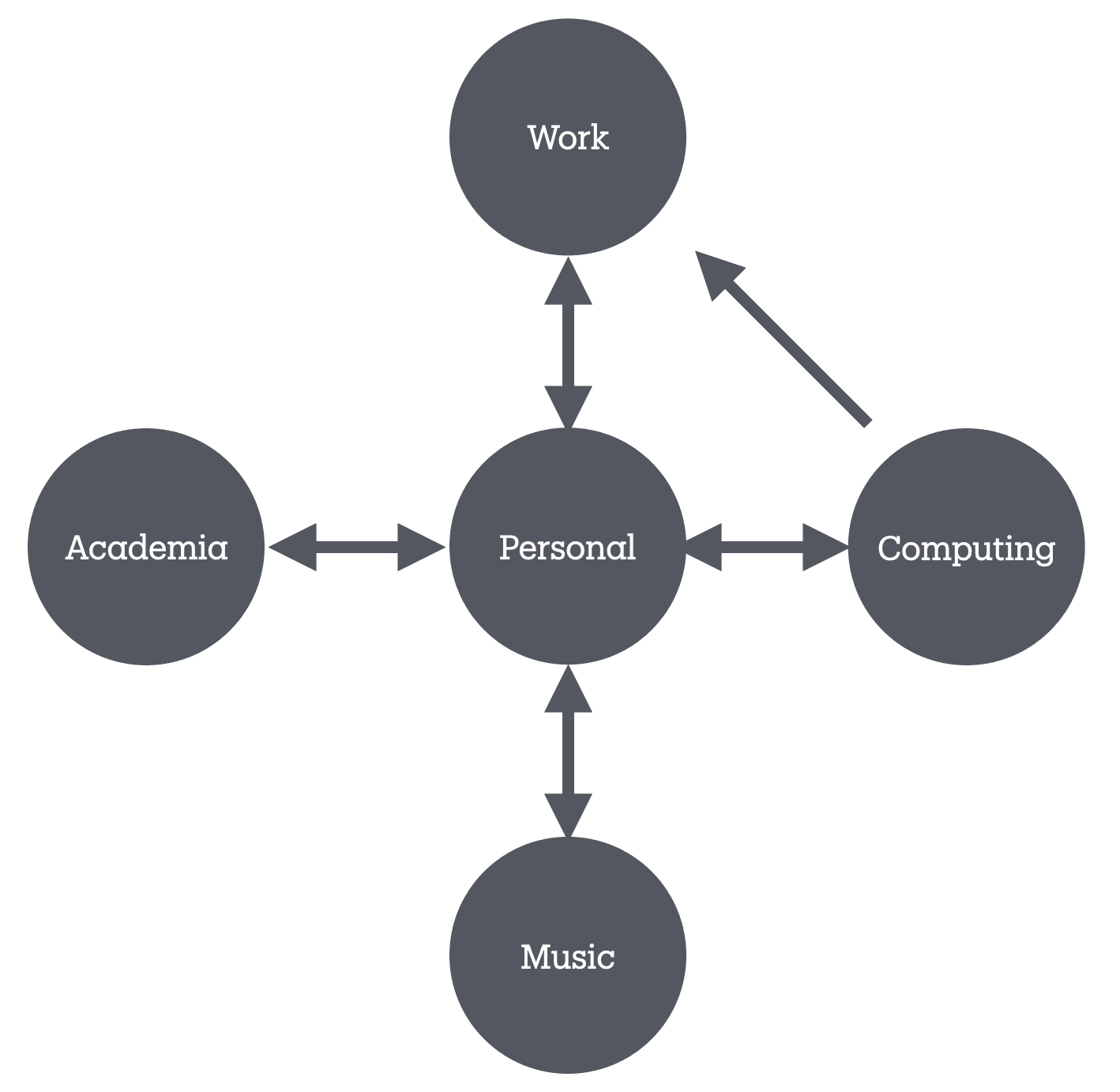 The arrows indicate which workspaces can access one another’s content (the “allow content from” relation). My personal workspace can access all the others and they can access it. (None of my workspaces are shared with others.)