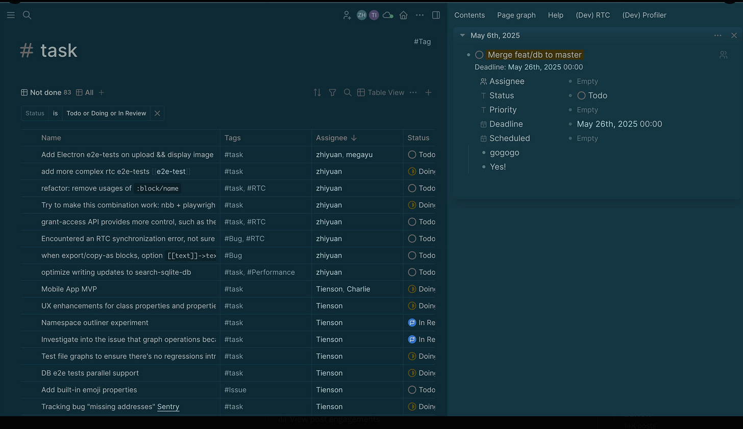 The dev is also looking for responses on whether to implement an Obsidian Bases / Logseq DB type set-up. For more, check Discord.