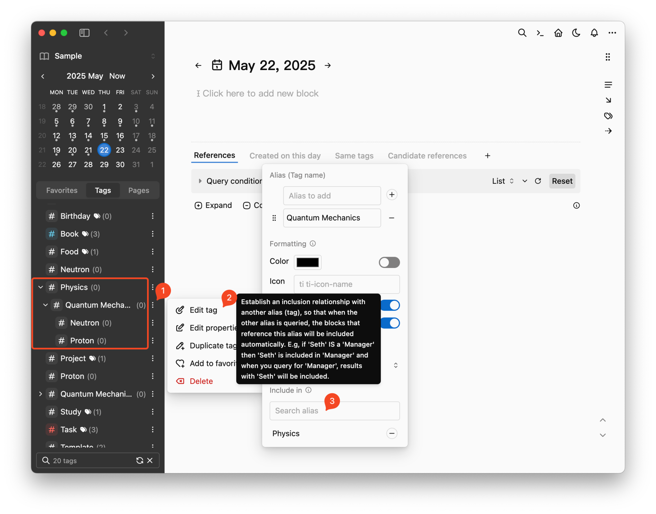 There was a question on Discord regarding subtags and whether these were possible and it seems that the answer is yes, in a way. While there is no parent-child relationship between tags, there is an "inclusion" relationship, which works kind of like parent-child. E.g, Quantum Mechanics is included in Physics. See the screenshot for how to create this inclusion relationship.