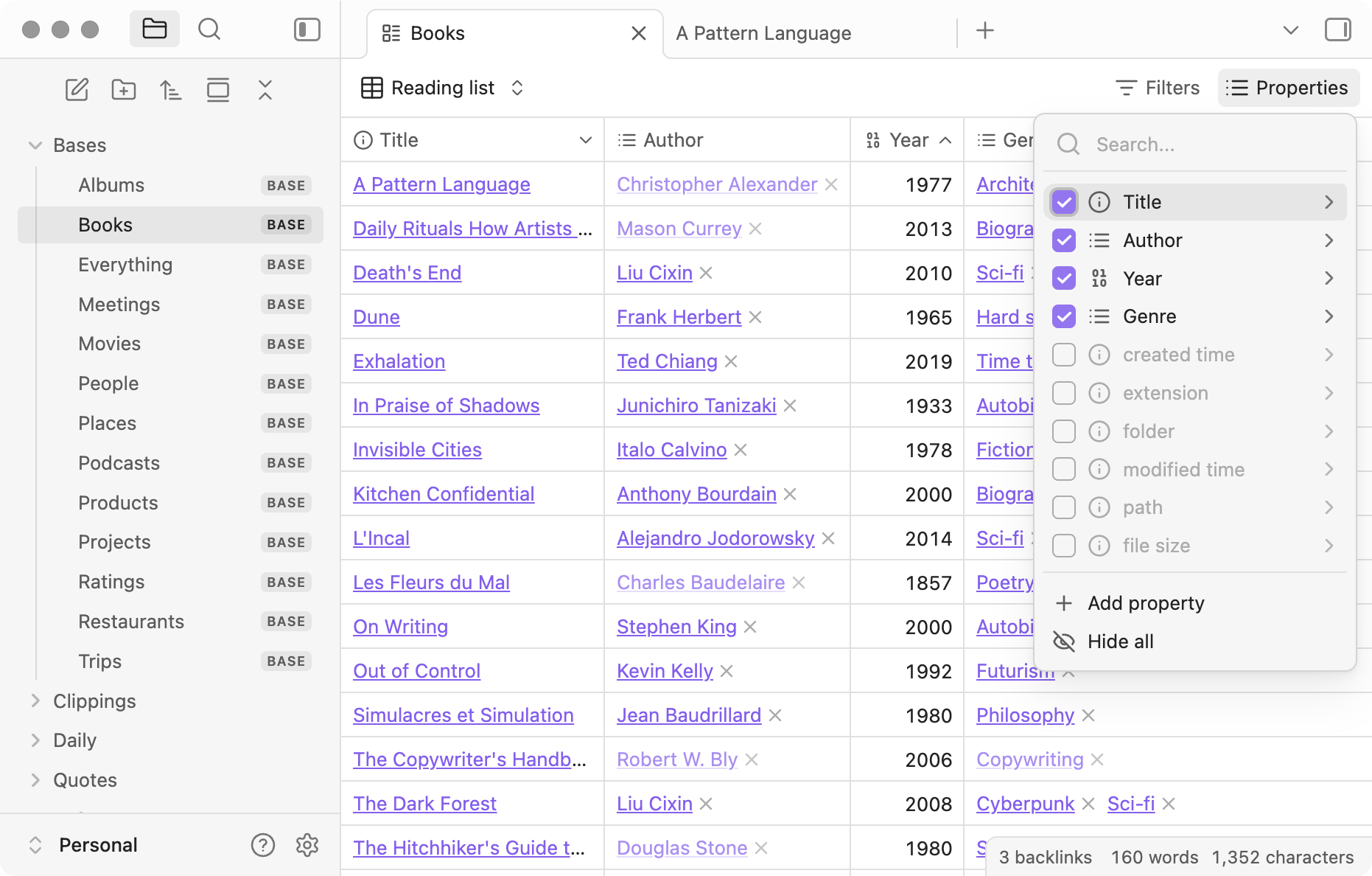 Do we need to say anymore? Bases is a core plugin that lets you turn any set of notes into a powerful database. With bases, you can organise everything from projects to travel plans, reading lists, and more.