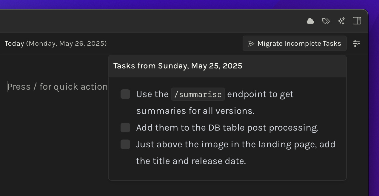 Mobile: Tapping the calendar icon twice will create and focus daily note at bottom.