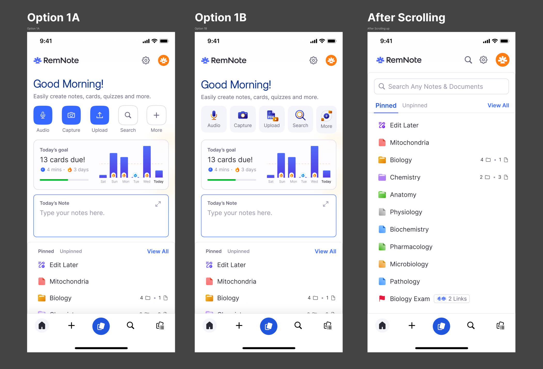 We’re exploring some new designs for the RemNote Mobile Home to make it simpler and more intuitive to use. I’ve put together a few design options and would love to hear what you think!