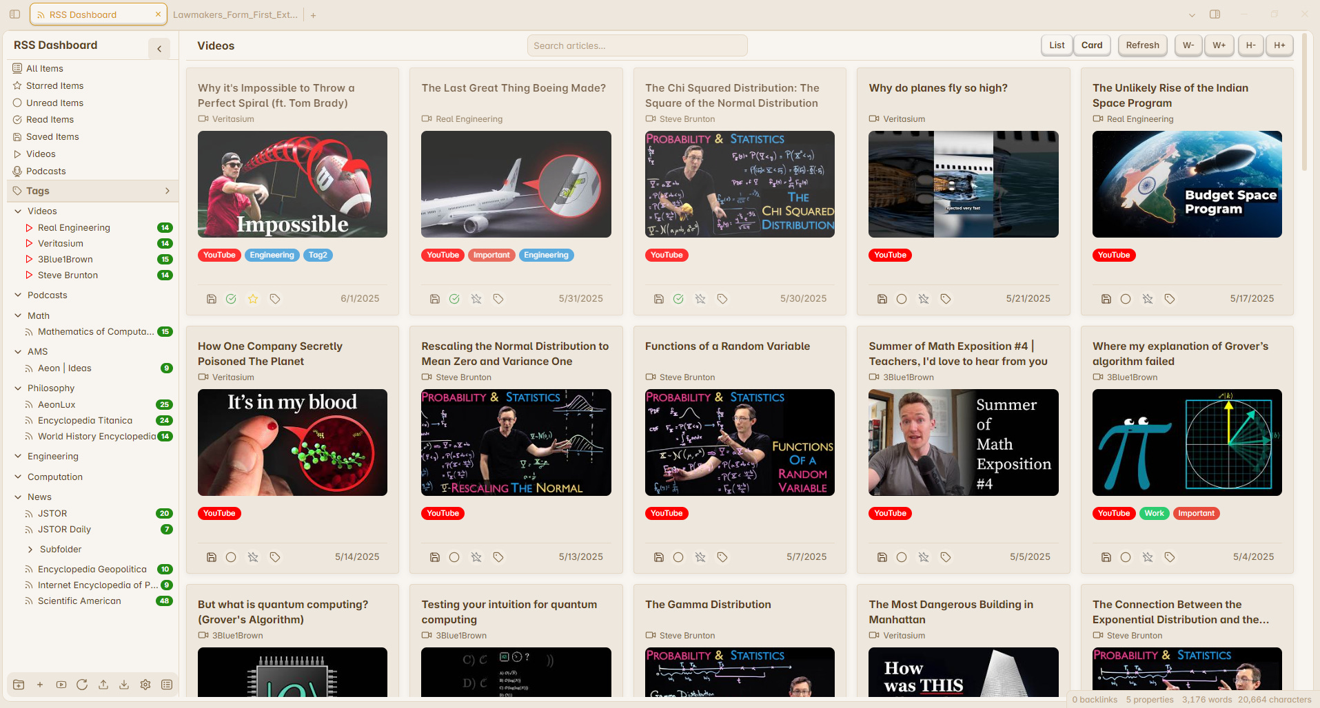It's an Obsidian plugin to bring your favourite RSS feeds, YouTube videos, and podcasts (working on) more directly inside Obsidian. You can collect your feeds, consume them (read, watch, or listen), and save them as Markdown file**,** perfect for archiving, referencing, or just building a knowledge base of what you want to consume.