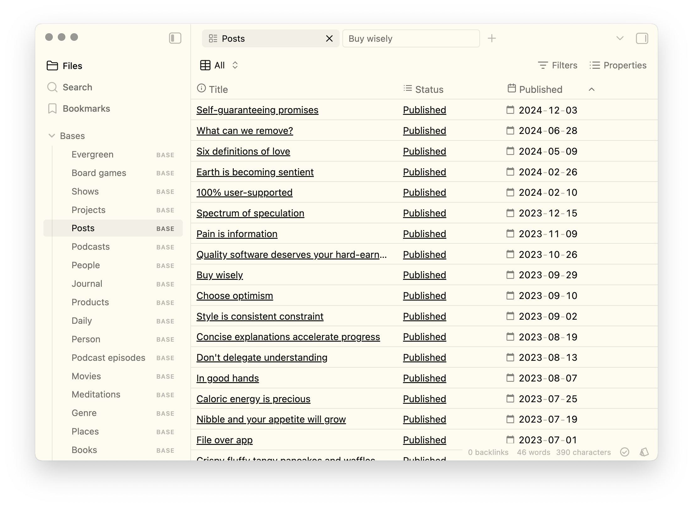 I was playing around with the new Obsidian Bases (insider only for now) feature to see if I could recreate an "On This Day" DataView query - basically a query that returned all my journal notes of the past years based on today's day.