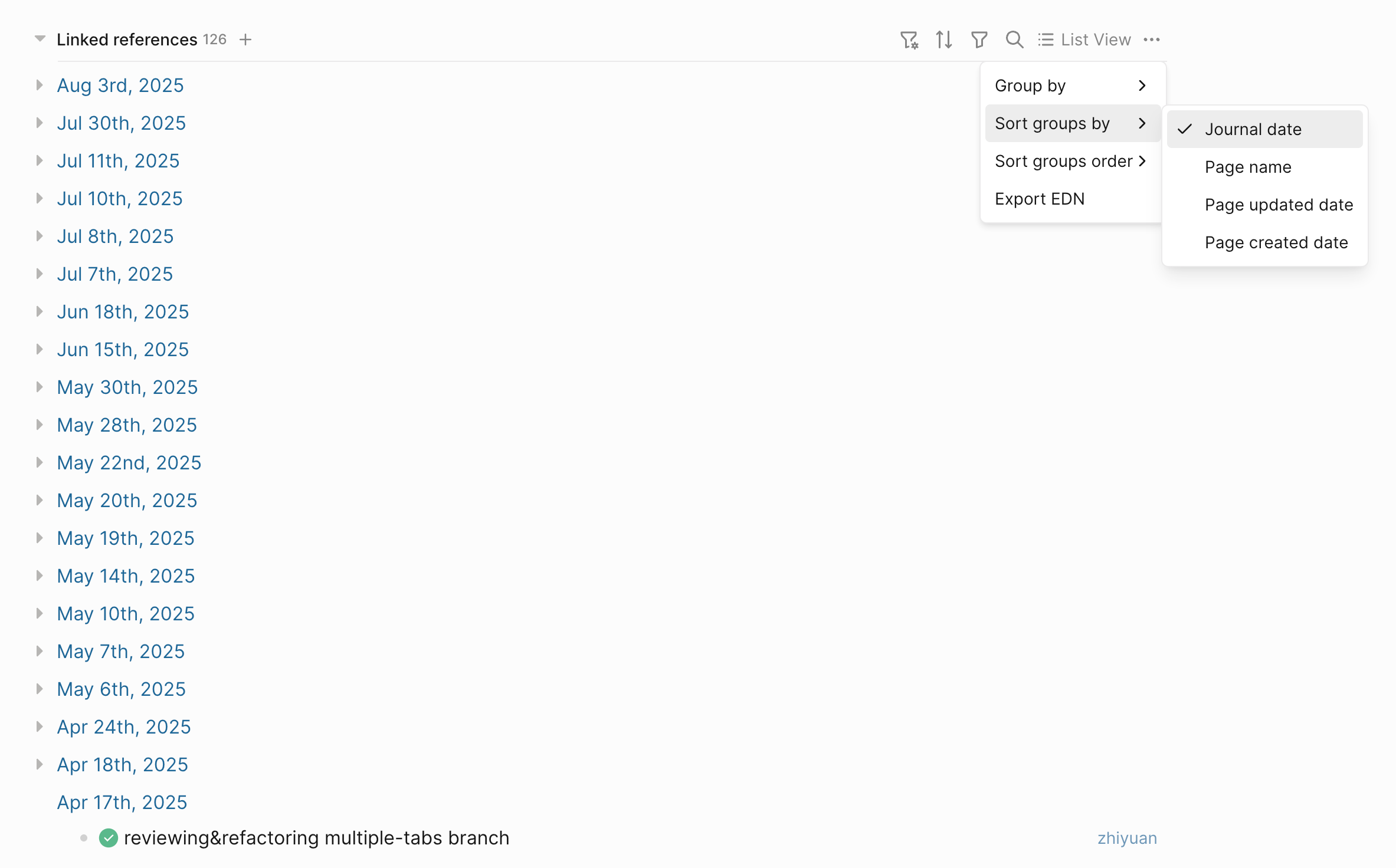 Adds support for sorting groups by journal date, page title, updated date, or created date