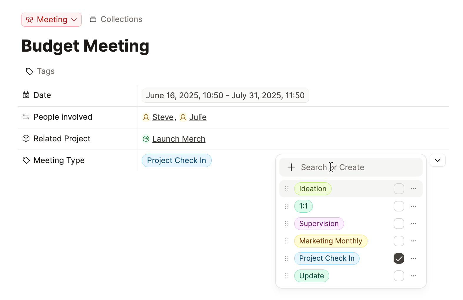 Labels provide a dropdown menu ideal for categorising items such as meeting types, reading status, project phases, and more. They will also be compatible with the upcoming group-by functionality in object types and queries.