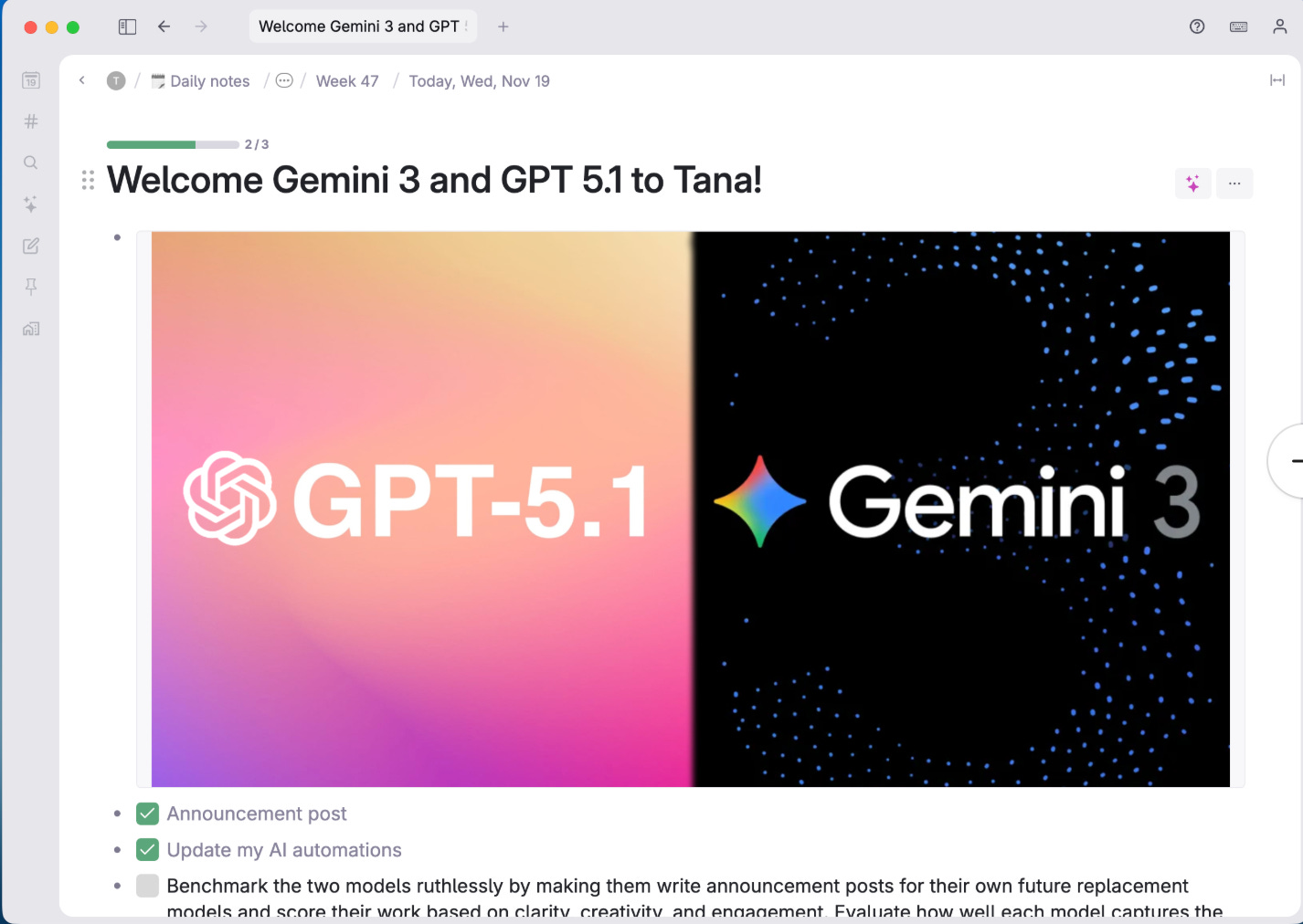 New - Sidebar progress bars. Drag nodes with progress indicators to the sidebar to display circular progress bars that update automatically. Hover for completed/total count, expand to work with tasks directly.