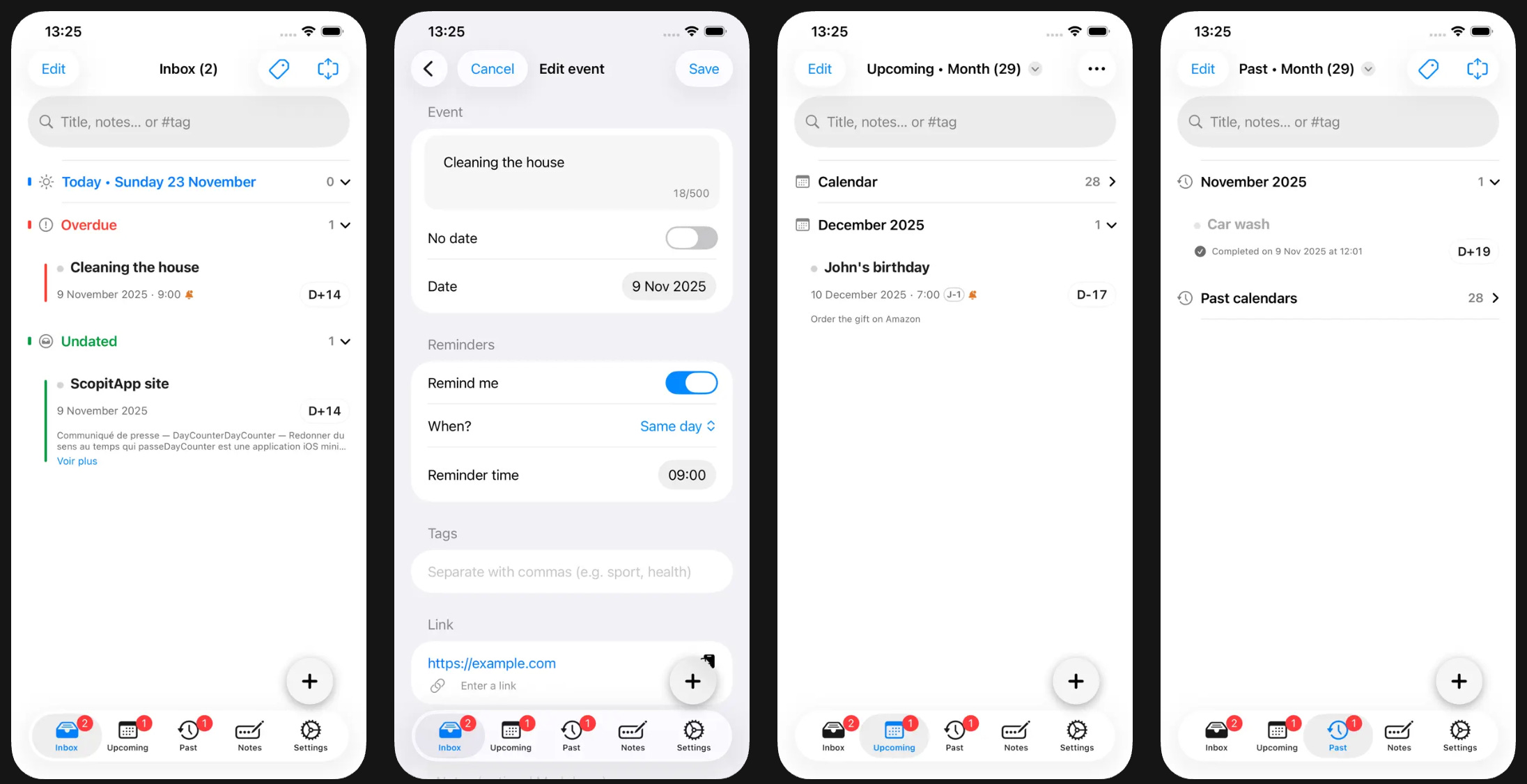 It organises events, due dates and reminders into three simple timelines: Today, Upcoming, Past