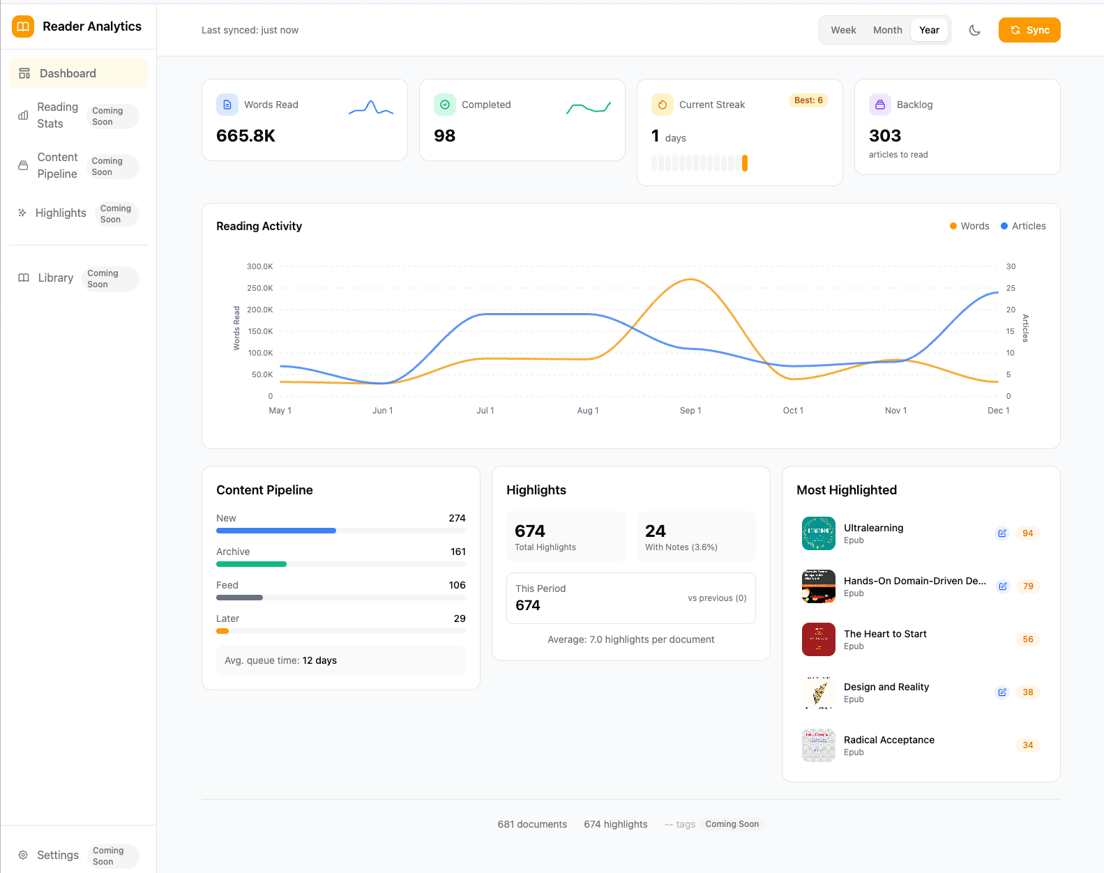 Readwise Reader analytics dashboard? OP went and built a dashboard for reading velocity, streaks, pipeline metrics, and highlight patterns.