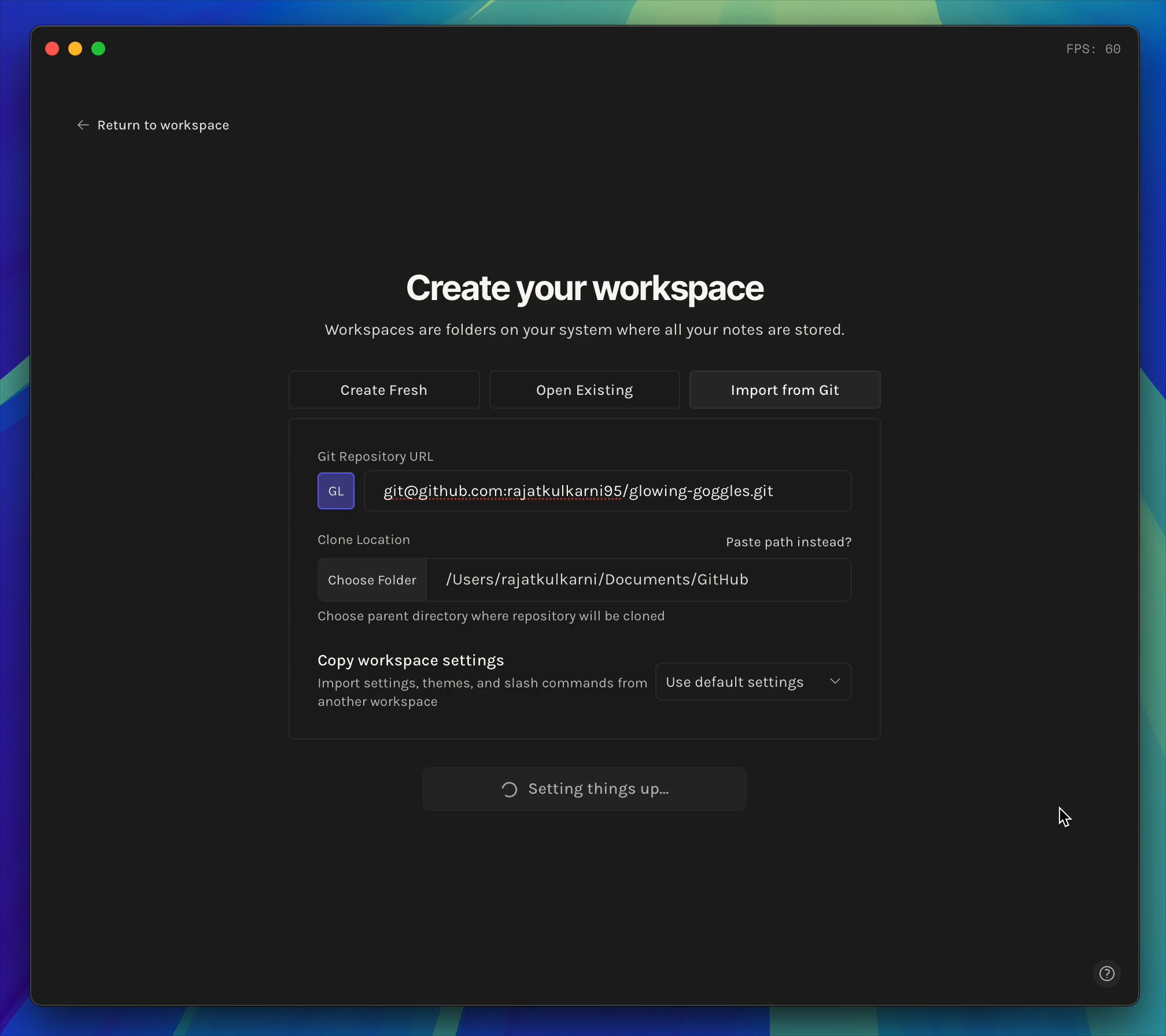 Create Fresh: Sets up a brand new workspace folder on your device, complete with a Welcome note and a Daily folder.