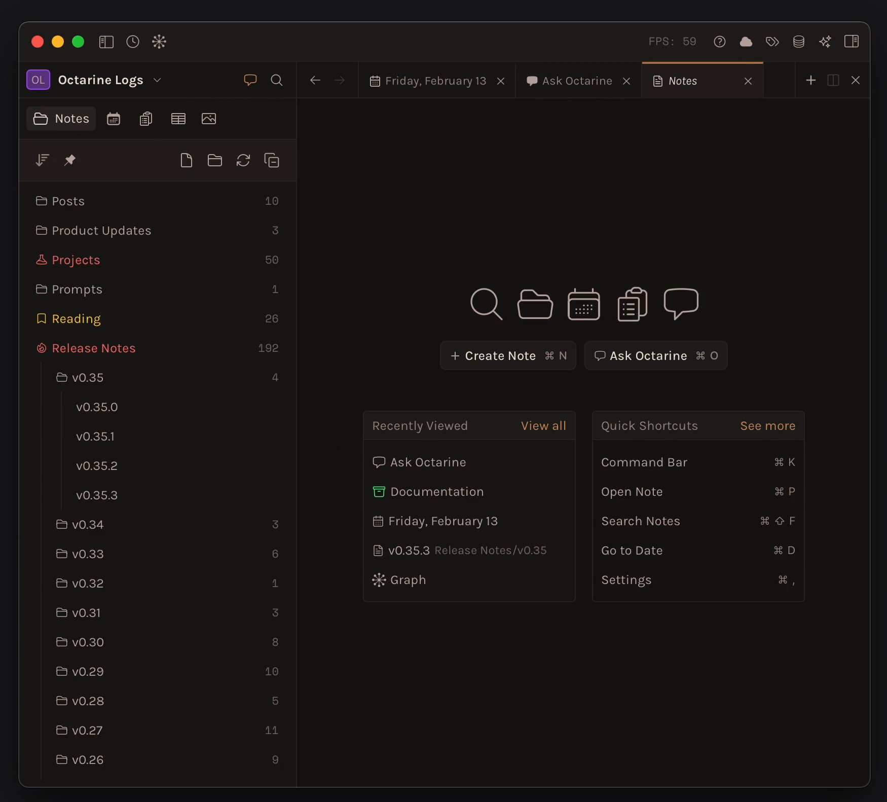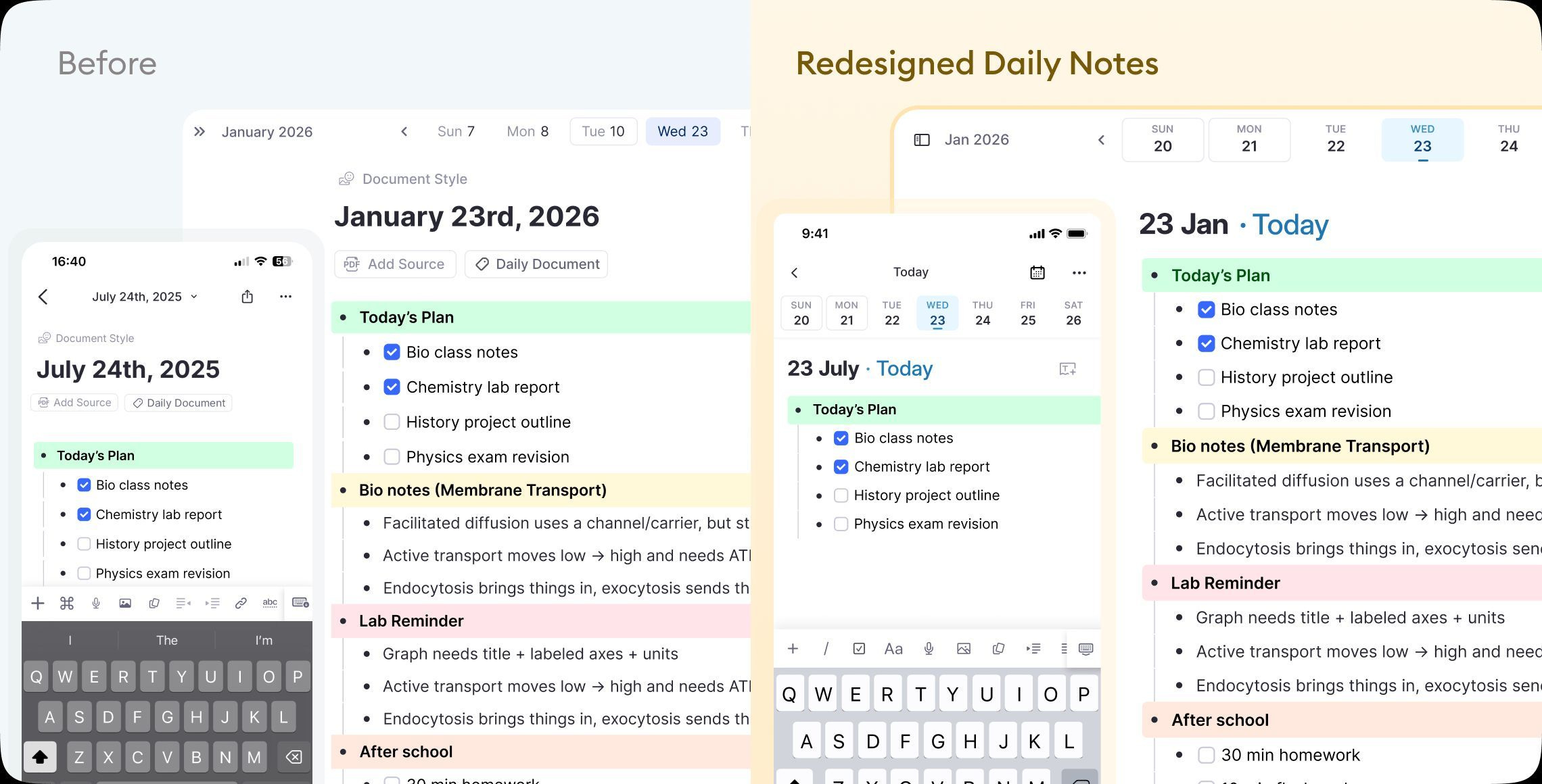 Redesigned Daily Notes - The new daily notes page is cleaner, helping you focus on your work. It also emphasises templates, which you can use to structure your day.